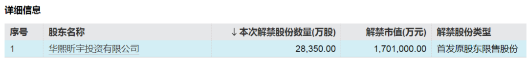 解禁市值最大的华熙生物,解禁股东为华熙昕宇投资有限公司,为华熙生物第一大股东。
