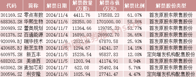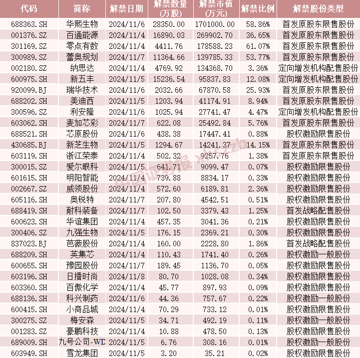 具体来看,华熙生物11月6日将解禁2.84亿股,百通能源11月4日将解禁1.69亿股,零点有数11月4日将解禁411.76万股,以上均为首发原股东限售股份。