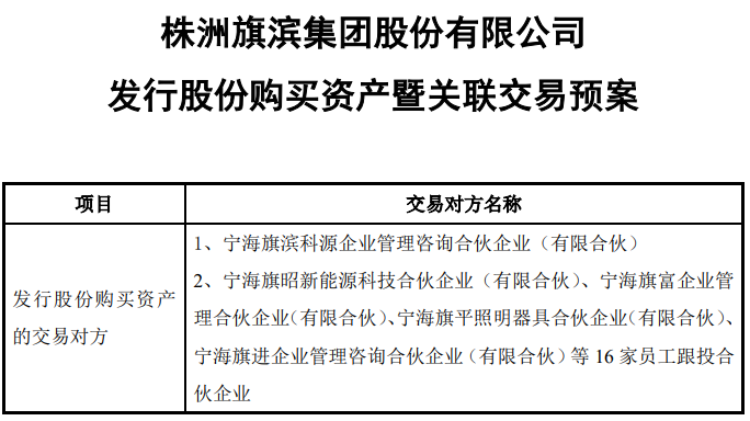 11月5日晚,旗滨集团(601636)公告,拟通过发行股份的方式购买控股子公司旗滨光能28.78%的股权,交易对手方分别是公司实控人俞其兵控制的宁海旗滨科源企业管理咨询合伙企业(下称旗滨科源)及16家员工持股平台,本次交易不涉及募集配套资金。