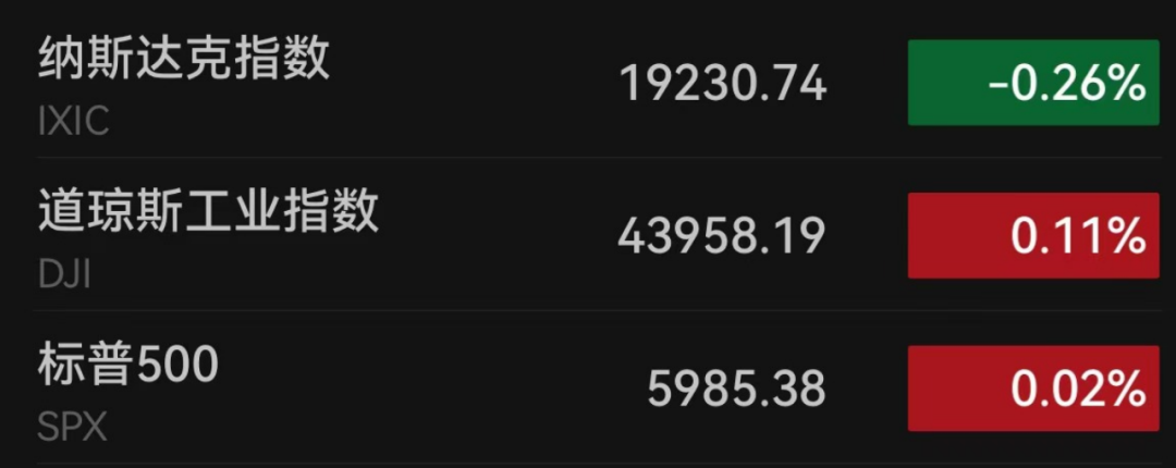 当地时间11月13日周三,美股三大股指涨跌不一。截至收盘,道指涨47.21点,涨幅为0.11%,报43958.19点;纳指跌50.66点,跌幅为0.26%,报19230.74点;标普500指数涨1.39点,涨幅为0.02%,报5985.38点。