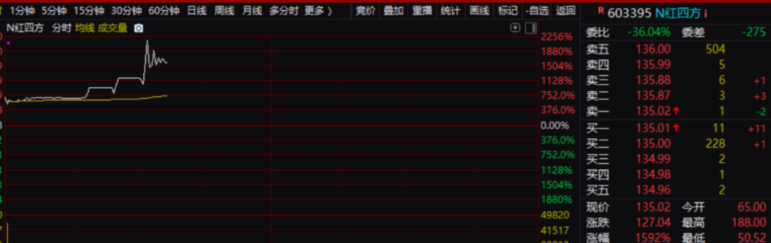 今天早盘,新股N红四方(603395)复牌后持续走高,成交金额超18亿元,股价最高达188元,盘中最大涨幅一度达2256%,按其发行价7.98元/股计算,中一签可赚超9万元。在近期打新收益有所收敛的背景之下,该股的表现可以说非常亮眼。