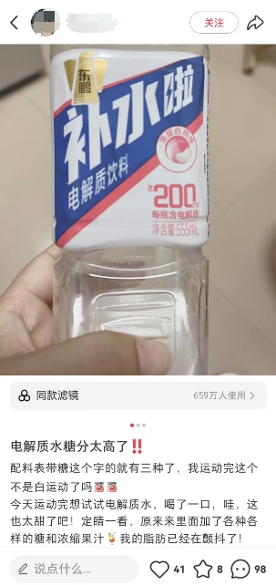 据东鹏饮料内部人士预测,电解质产品补水啦今年预计能完成近11亿元销售额。不过东鹏饮料旗下电解质产品补水啦同样陷入糖分超出预期的质疑。在社交媒体上,有消费者表示运动之后想来瓶电解质产品,发现东鹏补水啦排在配料表第二名的是白砂糖,“一款电解质水产品加了各种糖和浓缩果汁,喝完后感觉自己白运动了。”