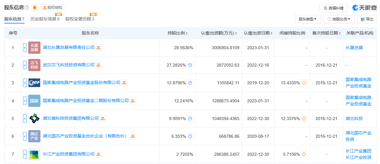 此外,湖北省国资委旗下的长江产业投资集团有限公司为长江存储科技控股有限责任公司的单一第七大股东。