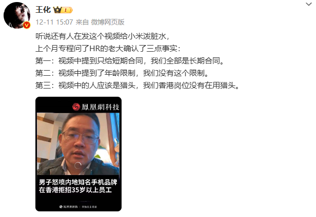 此外,近日,有网友在社交平台发视频称,某内地知名手机品牌在香港拒招35岁以上员工,引发热议。对此,12月11日,王化发文辟谣,称公司招聘“没有这个限制”。