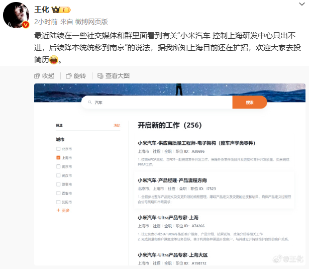 小米汽车上海研发中心只出不进?小米高管辟谣:目前还在扩招