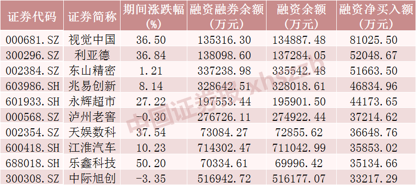 从个股情况来看,上周融资客加仓居前的10只股票分别为视觉中国、利亚德(300296)、东山精密(002384)、兆易创新(603986)、永辉超市(601933)、泸州老窖(000568)、天娱数科(002354)、江淮汽车(600418)、乐鑫科技、中际旭创(300308),分别净买入8.10亿元、5.20亿元、5.17亿元、4.68亿元、4.42亿元、3.72亿元、3.66亿元、3.59亿元、3.51亿元、3.32亿元。从市场表现上看,上周融资客加仓居前十的股票涨多跌少,跌幅最大的中际旭创跌逾3%,涨幅最大的乐鑫科技涨逾50%。