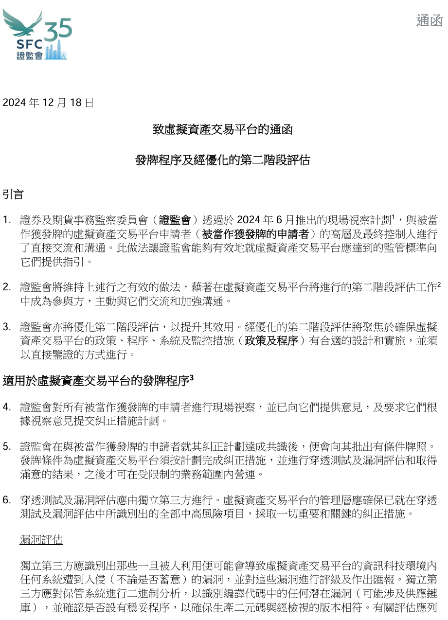 12月18日,香港证监会发出通函,为虚拟资产交易平台发牌程序制定清晰的路线图,并就第二阶段评估提供更多指引。