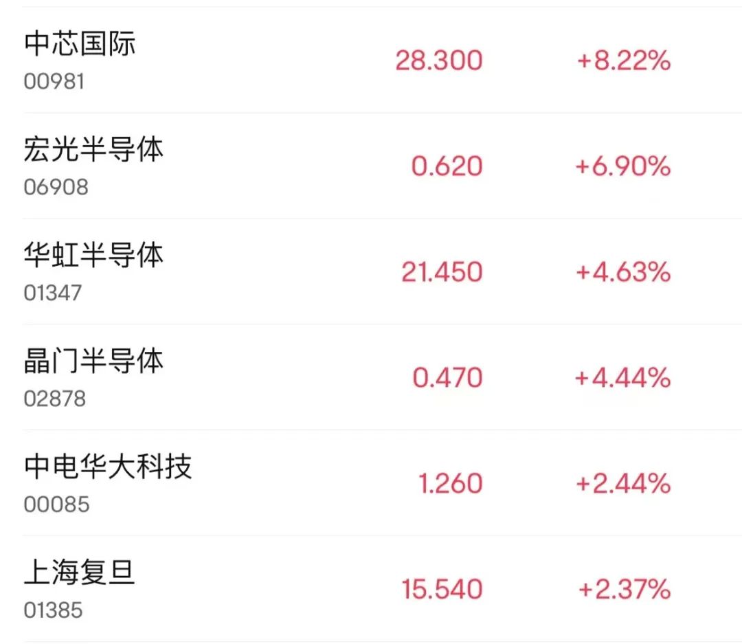 12月20日,港股半导体芯片股全天强势。龙头中芯国际大涨超8%领衔市场,宏光半导体涨6.9%、华虹半导体、晶门半导体、上海复旦皆上涨。