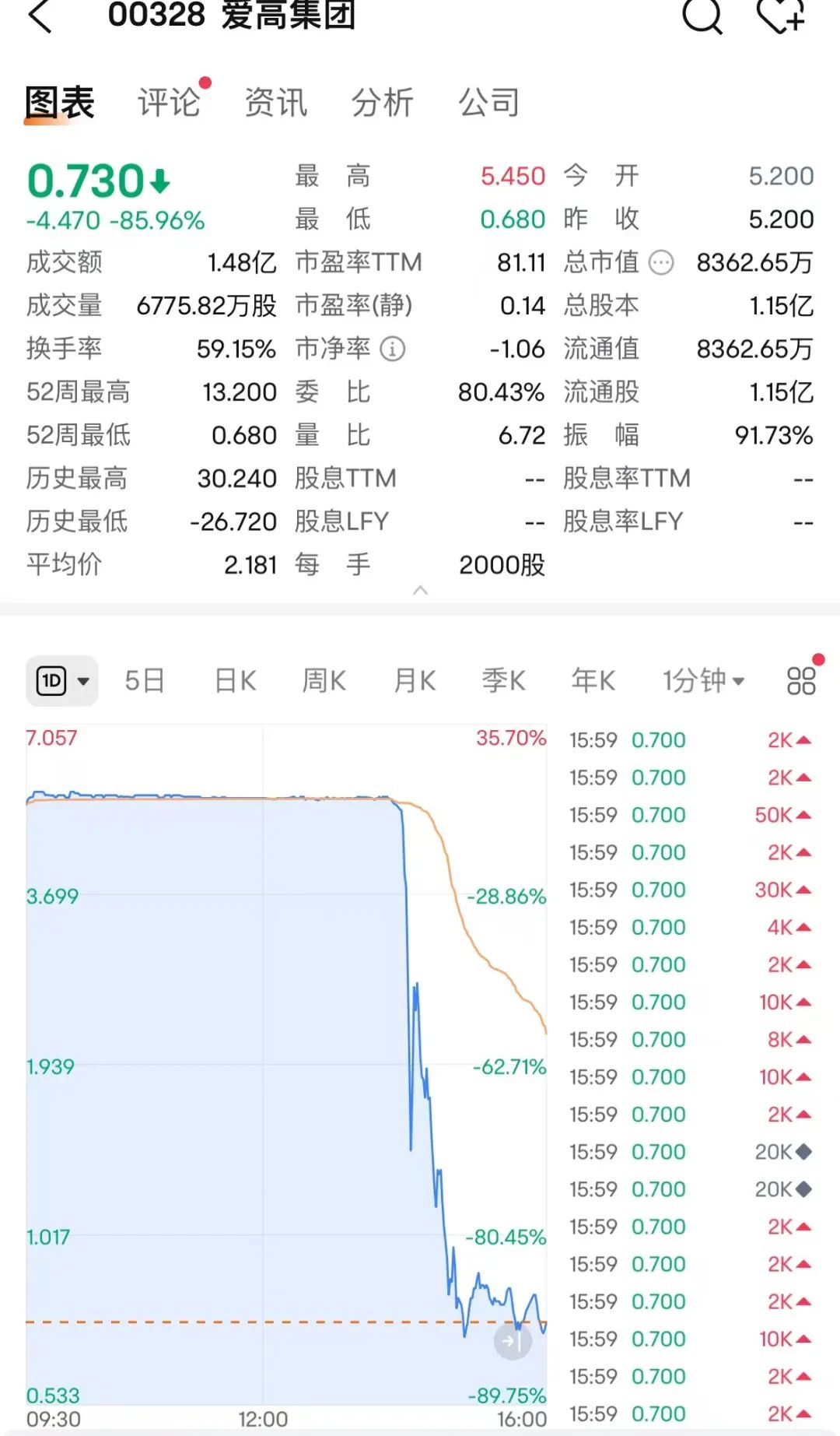 爱高集团闪崩超85%