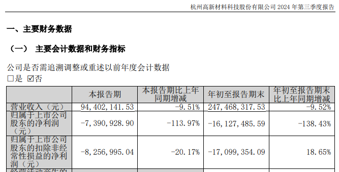 2024年前三季度,杭州高新实现营业收入2.47亿元,同比下降9.52%;归母净利润为-1612.75万元,由2023年同期盈利转为亏损。