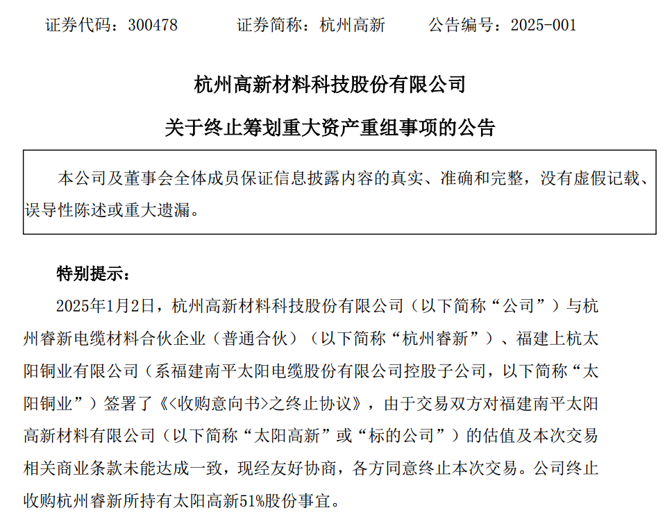 1月2日,杭州高新与杭州睿新电缆材料合伙企业(普通合伙)(以下简称杭州睿新)、福建上杭太阳铜业有限公司(以下简称太阳铜业)签署了《〈收购意向书〉之终止协议》。