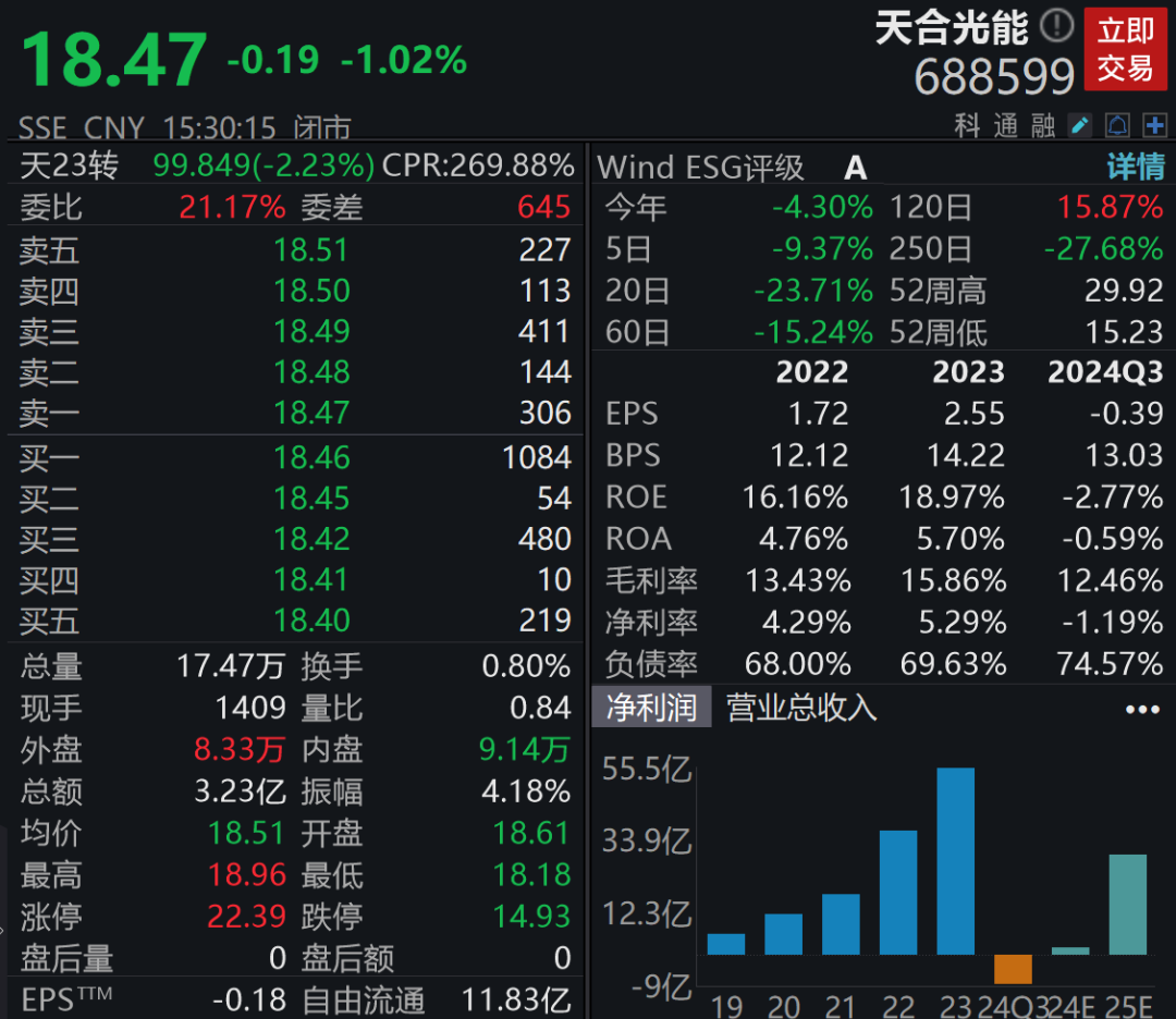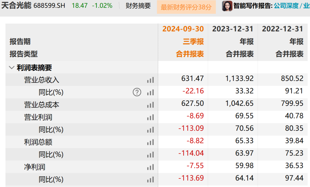 财报显示,天合光能去年前三季度,天合光能实现营业收入631.47亿元,同比下滑22.16%;归母净利润亏损8.47亿元,同比由盈转亏。