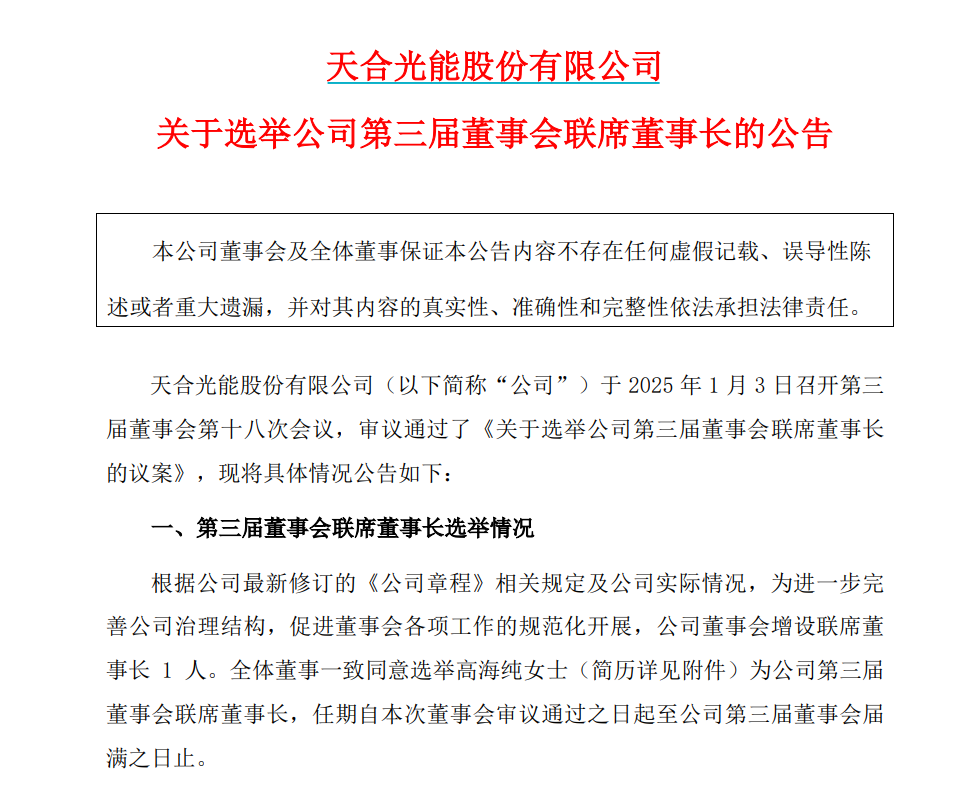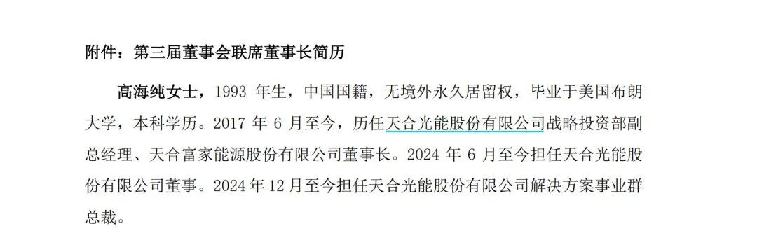 A股光伏巨头天合光能迎来最新人事变动。现年32岁的高海纯,新任天合光能联席董事长并兼任公司解决方案事业群总裁。