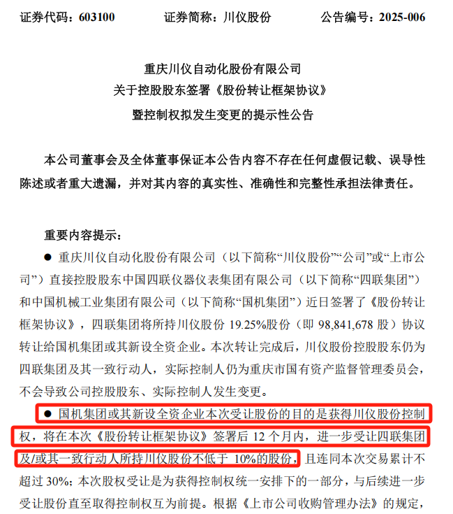【导读】川仪股份披露控制权变更步骤,将引入央企国机集团