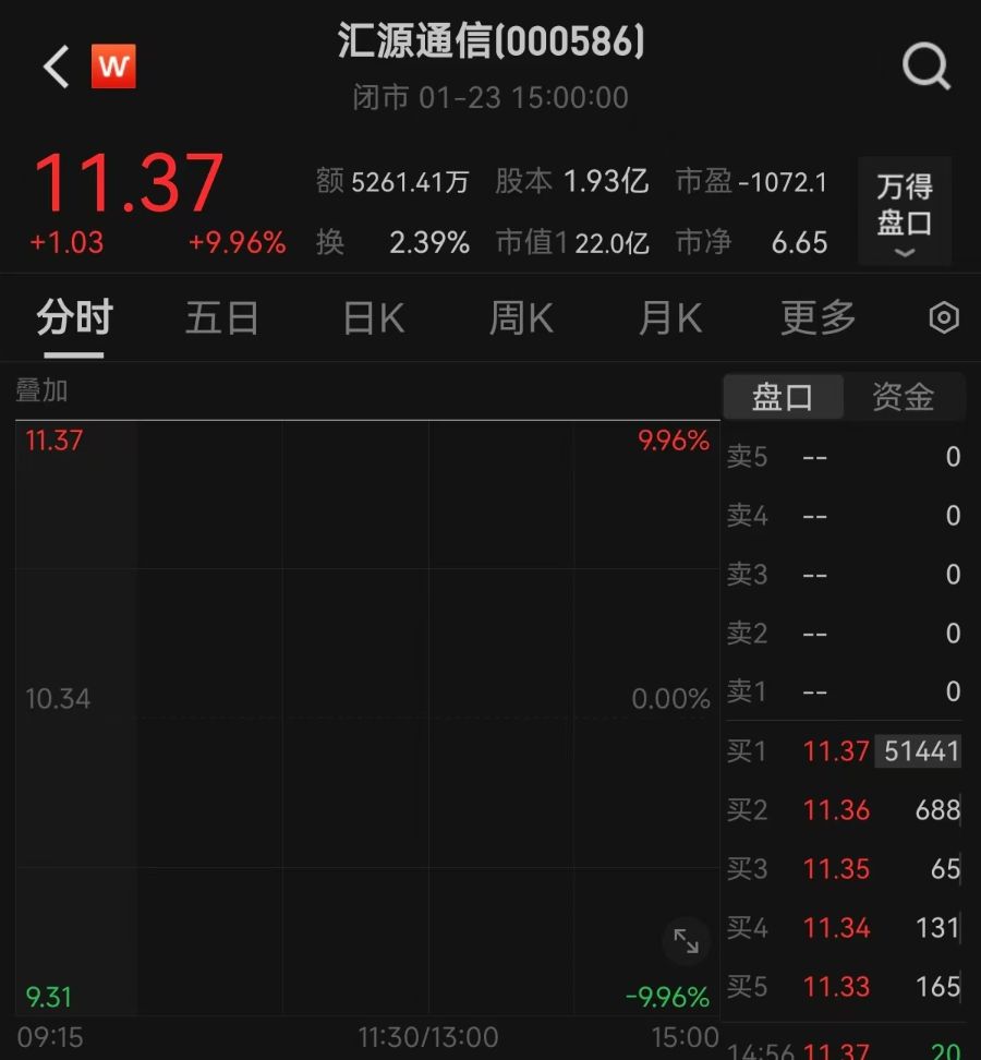 值得注意的是,昨日(1月23日)算力硬件股持续走强,龙头股太辰光(300570)涨超5%,再创历史新高。汇源通信也被市场普遍认为是受益标的,开盘即一字涨停。