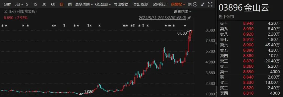 DeepSeek概念依旧火热,板块指数继续放量高开高走大涨逾8%,半日成交超昨日全天成交。每日互动(300766)连续第3日20%涨停,安凯微(688620)、青云科技(688316)、优刻得(688158)则连续第2日“20cm”封板,光云科技(688365)、天娱数科(002354)等逾10股也涨停或涨超10%。