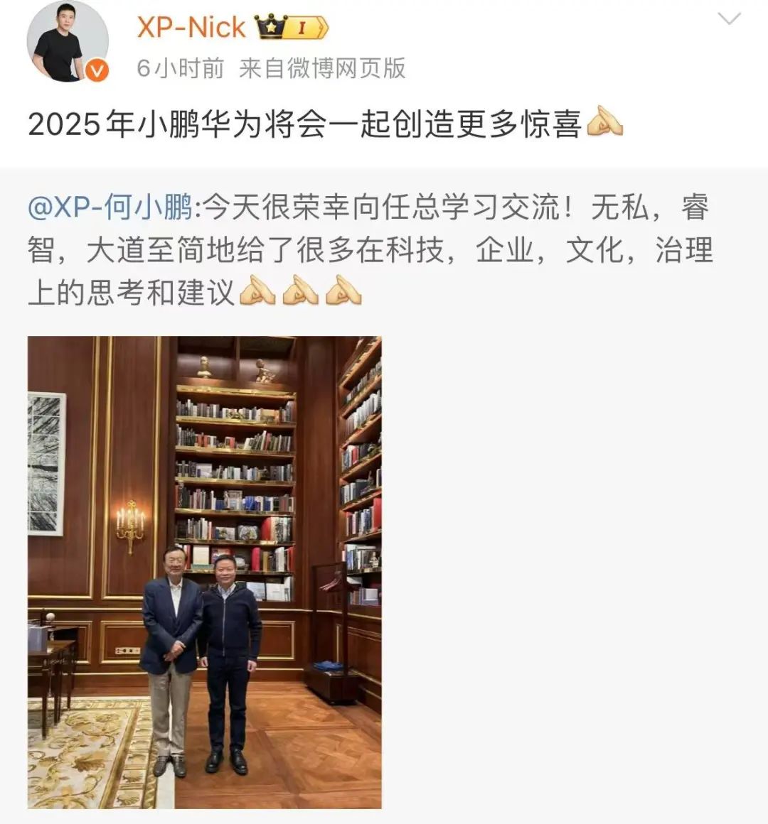 2月12日,何小鹏在微博上晒出与任正非的合影,并写道:“今天很荣幸向任总学习交流!无私,睿智,大道至简地给了很多在科技、企业、文化、治理上的思考和建议。”