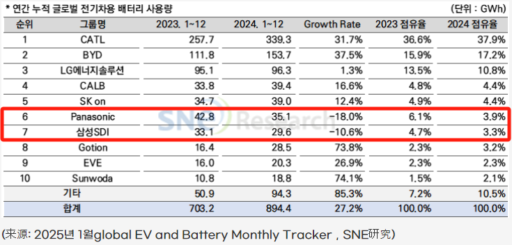 松下、三星SDI的2024年全球动力电池使用量分别为35.1GWh、29.6GWh,同比分别下降18.0%、10.6%;市占率分别为3.9%、3.3%,同比分别下降2.2%、1.4%。