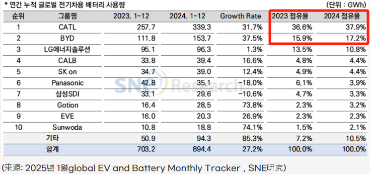 比亚迪2024年的新能源汽车销量达427.21万辆,市场预计其2025年销量目标约为600万辆。SNE Research认为,比亚迪凭借下游新能源汽车销量的支撑,正在快速抢占全球动力电池的市场份额。