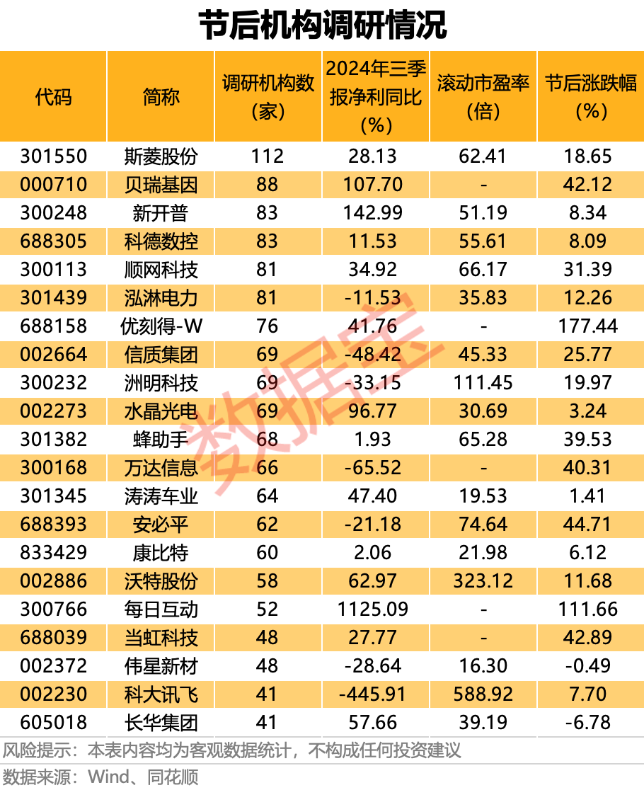 节后机构调研个股数量有180多只,斯菱股份(301550)成为唯一一只调研机构数超百家的股票。