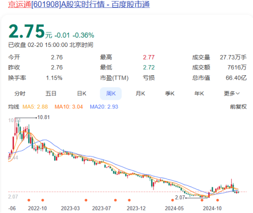 京运通股价表现同样不容乐观。2022年7月以来,公司股价长期处于下降通道,至2025年2月20日收盘,报2.75元/股。在最近两年多的时间里,市值已跌去了近70%。