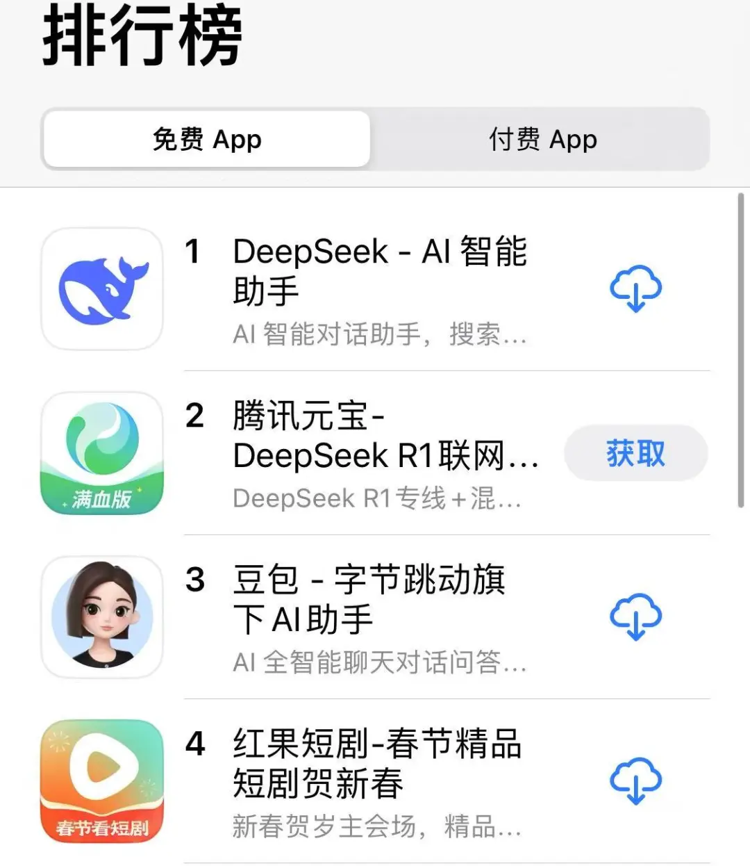 2月22日,苹果商店显示,腾讯元宝超越豆包,升至中国区苹果免费APP下载排行榜第二,DeepSeek继续位居榜首。
