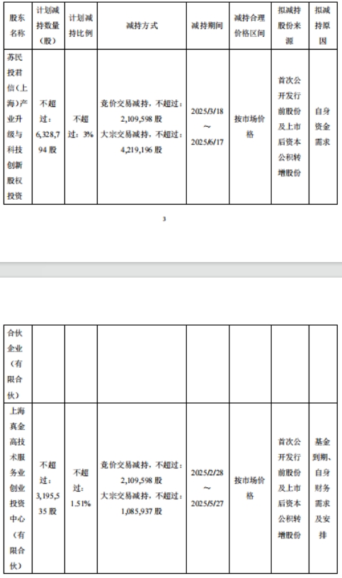 因基金到期、股东自身财务需求及安排,上海真金高技术服务业创业投资中心(有限合伙)(以下简称“真金投资”)拟通过集中竞价或大宗交易的方式减持不超过3,195,535股公司股份,拟减持比例不超过公司当前总股本的1.51%。其中拟通过集中竞价交易方式减持其持有的公司股份数量不超过2,109,598股,占公司总股本的比例不超过1%;拟通过大宗交易方式减持其持有的公司股份数量不超过1,085,937股,占公司总股本的比例不超过0.51%。通过集中竞价或大宗交易方式减持的,自减持计划公告披露之日起3个交易日后的3个月内进行。公司股东真金投资已通过中国证券投资基金业协会备案,符合《上市公司创业投资基金股东减持股份的特别规定》和《上海证券交易所上市公司创业投资基金股东减持股份实施细则》的减持特别规定,通过集中竞价或大宗交易方式减持股份总数不受比例限制。