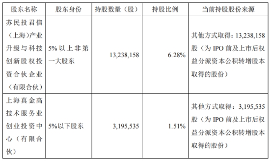 截至公告披露日,公司股东苏信基金持有公司13,238,158股股份,占公司当前总股本的6.28%,为持有公司股份比例在5%以上的非第一大股东;公司股东真金投资持有公司3,195,535股股份,占公司当前总股本的1.51%。上述股份均为公司首次公开发行前及上市后权益分派资本公积转增股本取得的股份,并已上市流通。