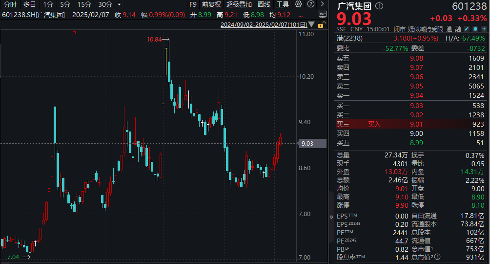 截至2月27日收盘,广汽集团报收9.03元/股,涨0.33%,市值约为931亿元。