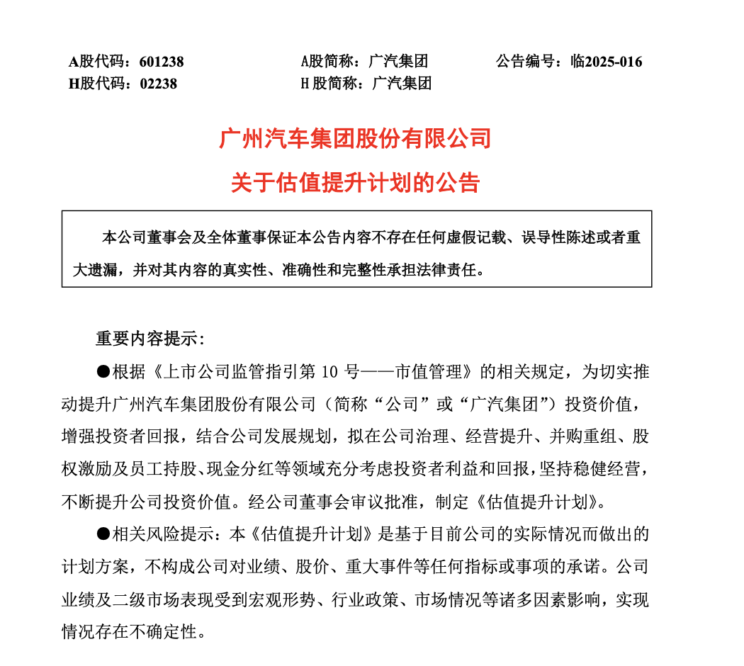 刚刚,广汽集团披露估值提升计划