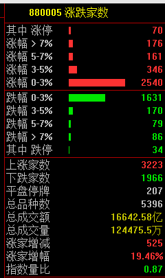 市场共3223只个股上涨,70只个股涨停,1966只个股下跌。