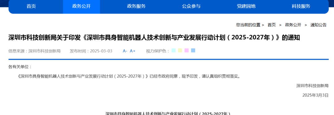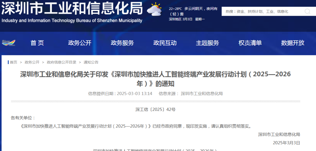 3月3日,深圳市发布《深圳市加快推进人工智能终端产业发展行动计划(2025—2026年)》、《深圳市具身智能机器人技术创新与产业发展行动计划(2025-2027年)》两份通知。