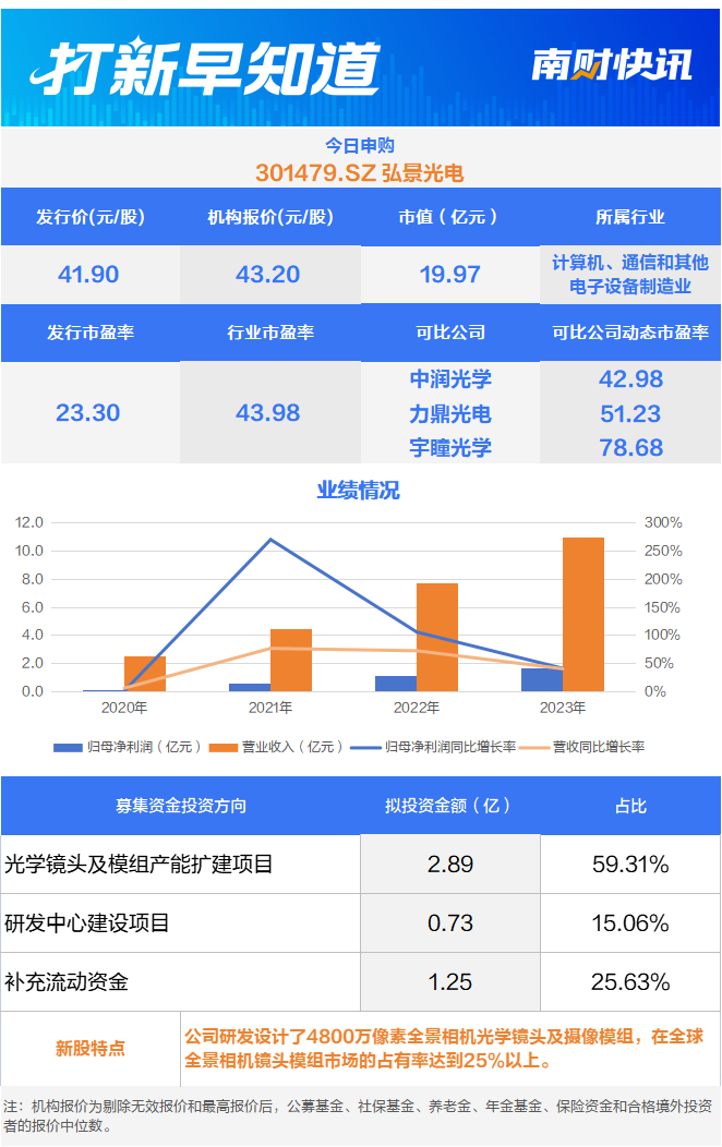 3月4日,有1只新股申购,为深交所创业板的弘景光电(301479)(301479.SZ)。有2只新股上市,分别为创业板的常友科技(301557)(301557.SZ)、上交所主板的汇通控股(603409)(603409.SH)。