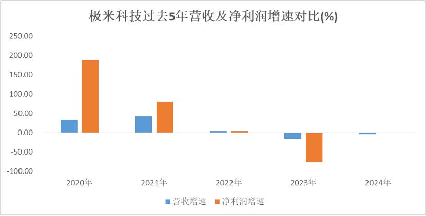 回首过去3年,极米科技可以说是“出道即巅峰,此后陷低谷”的代表,自2022年起公司业绩遭遇“滑铁卢”。2021年,公司营收及净利润均保持两位数的增速水平,但这一年也成为了公司业绩的拐点;2022年,公司营收、净利润增速均下降至个位数。自2023年至2024年,公司营收连续两年下滑;2023年公司净利润较上一年缩减75%以上,最新公布的快报显示,公司2024年净利润仅仅微增,勉强止住了持续下滑的局面。
