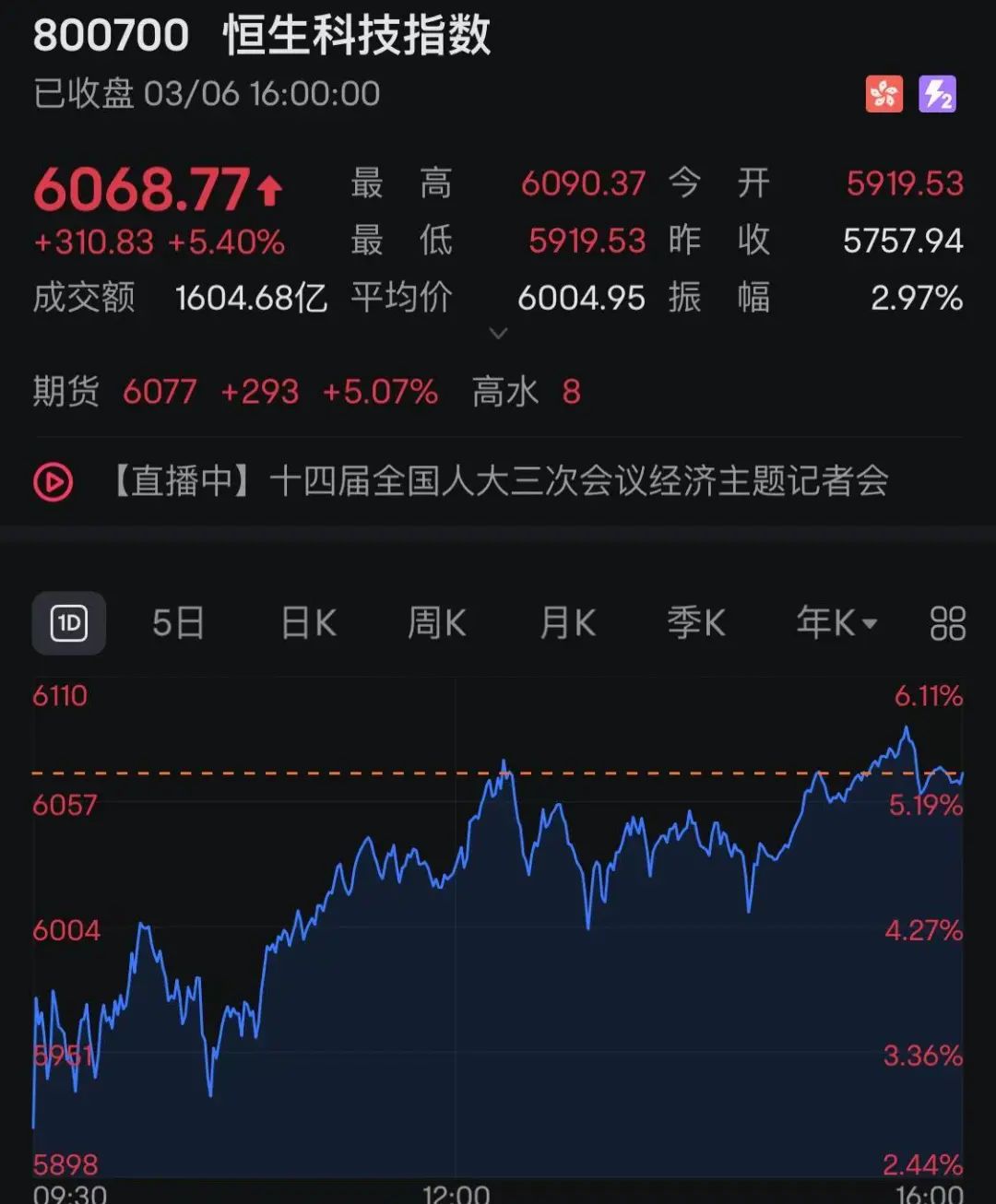 港股也全面大涨,恒生指数涨逾3%,创3年多来新高,恒生科技指数更是涨超5%。板块方面,恒生互联网科技指数飙涨逾8%,创2年多新高,明源云、金蝶国际等最高均涨超20%,腾讯控股、金山软件等均大幅高开高走。