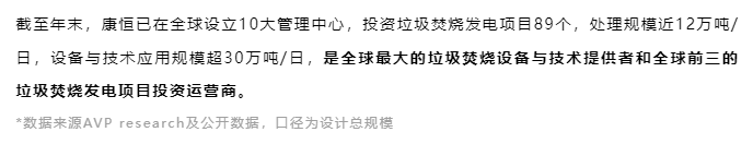 康恒环境官网透露,截至去年年末,公司已在全球设立10大管理中心,投资垃圾焚烧发电项目89个,处理规模近12万吨/日,设备与技术应用规模超30万吨/日。据称,康恒环境在中国垃圾焚烧发电投资领域占有超10%的市场份额,位列行业前三;在技术装备领域,公司占有约40%的销售市场份额。