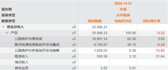 中公高科(603860)作为一家央企,在公路养护领域具有一定的技术优势和市场地位。其业务主要涵盖公路养护决策咨询、路况快速检测系统开发与集成、公路养护分析系统开发与销售等。其中,公路养护决策咨询业务在2024年的营收占比高达65.36%,是公司的核心业务板块。然而,从年报数据来看,这一核心业务板块并未展现出强劲的增长态势,未能有效带动公司整体业绩提升。