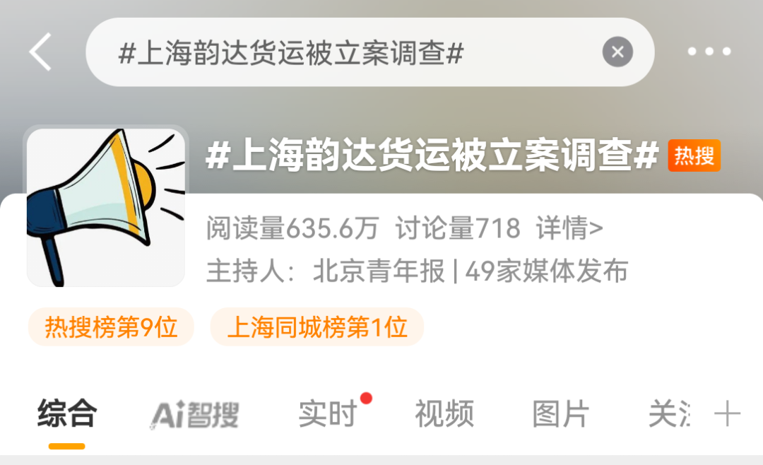 随即,“上海韵达货运被立案调查”成为热搜词条,排名热搜榜第9位,上海同城榜第1位。
