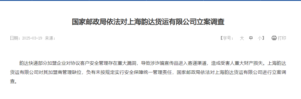 【导读】国家邮政局依法对上海韵达货运立案调查