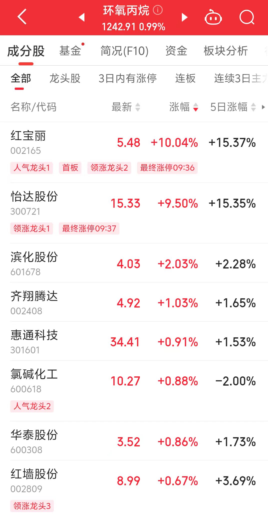 3月21日,红宝丽(002165)(002165.SZ)涨停,怡达股份(300721)(300721.SZ)一度20CM涨停,收涨9.50%,滨化股份(601678)(601678.SH)、齐翔腾达(002408)(002408.SZ)、华泰股份(600308)(600308.SH)等跟涨。