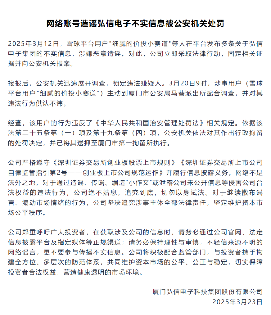弘信电子称,2025年3月12日,用户“细腻的价投小赛道”等人在平台发布多条关于弘信电子集团的不实信息,涉嫌恶意造谣。对此,公司立即采取法律行动,固定相关证据并向公安机关报案。