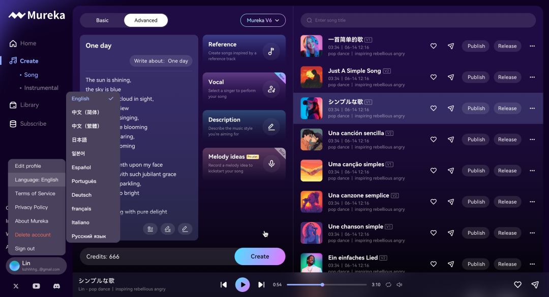 图丨Mureka V6支持10种语言的AI音乐创作