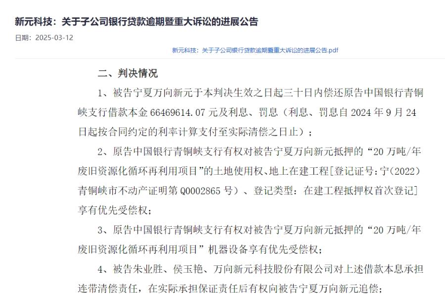 至于银行贷款逾期一事,新元科技12日表示,近日收到宁夏回族自治区青铜峡市人民法院出具的《民事判决书》,获悉子公司万向新元宁夏与中国银行股份有限公司青铜峡支行(简称“中国银行青铜峡支行”)金融借款合同纠纷的一审判决情况。