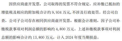 对于此次修正,公告称,因供应商虚开发票,公司取得的发票不符合规定,应补缴已抵扣的增值税及相应的附加税合计约9934万元,不涉及行政处罚。经公司自查,公司子公司存在相同供应商虚开发票的问题,根据会计准则,因子公司补缴税款事项对利润总额的影响约4800万元。上述补缴税款事项对利润总额的影响合计1.38亿元,计入2024年度当期损益。