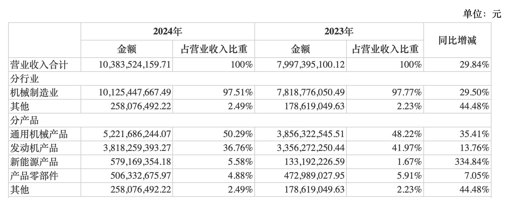 通用机械产品、发动机产品贡献了绝大多数营业收入:2024年,通用机械产品的营业收入为52.22亿元,同比增长35.41%;发动机产品的营业收入为38.18亿元,同比增长13.76%。