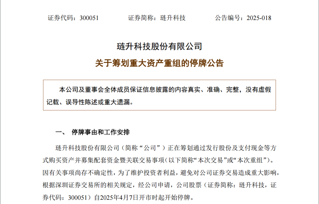 4月7日晚间,琏升科技(300051)公告称,公司正在筹划通过发行股份及支付现金等方式购买资产并募集配套资金暨关联交易事项,预计构成重大资产重组。
