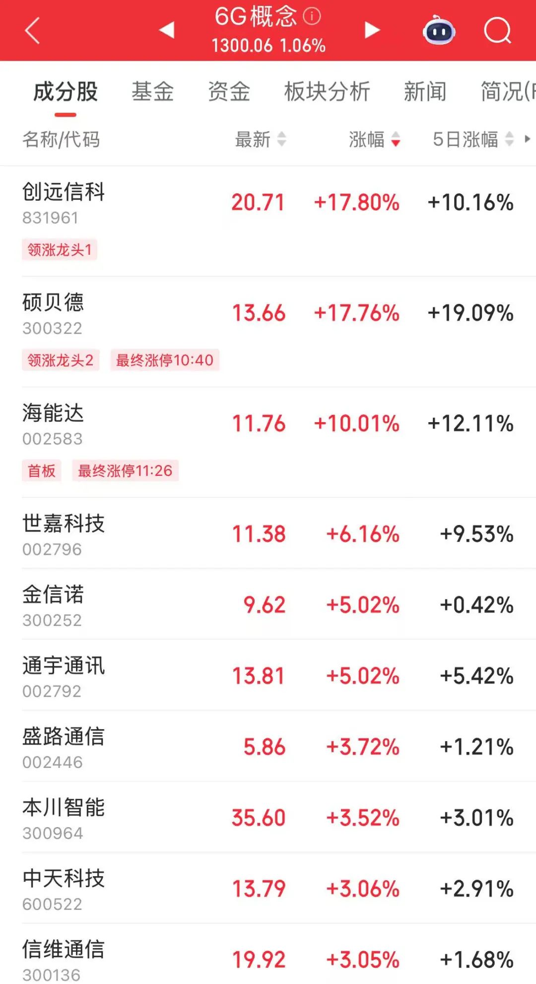 4月18日早盘,6G概念股集体走高,海能达(002583)、华脉科技(603042)收盘涨停,创远信科上涨17.8%,世嘉科技(002796)、大富科技(300134)、金信诺(300252)、通宇通讯(002792)涨幅均在5%以上。