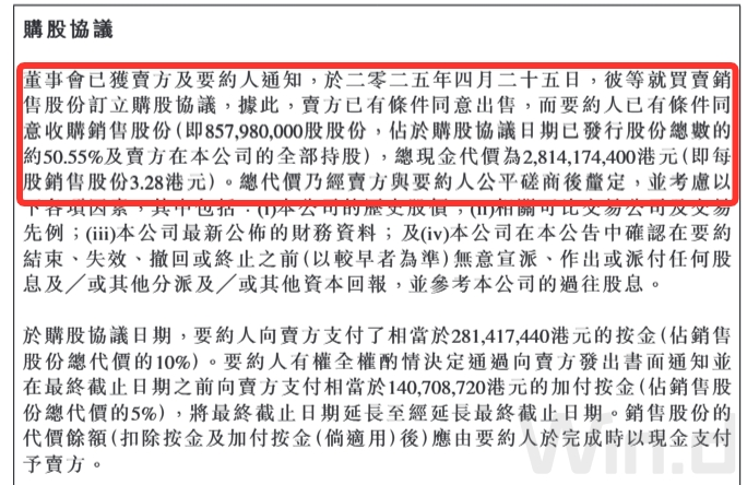 根据耀才证券公告,买卖双方已于4月25日签订协议,交易股份约为8.58亿股,占已发行股份总数的约50.55%;总现金代价为28.14亿港元,且已支付了10%的按金。要约收购价格为3.28港元/股,较耀才证券最后交易日在香港联交所的收市价2.79港元/股溢价约17.6%。