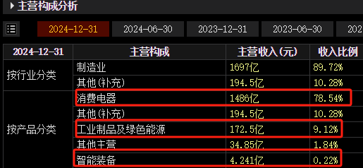 2024年年报中,格力电器介绍自己是一家多元化、科技型的全球工业集团,旗下拥有格力、TOSOT、晶弘三大消费品牌及凌达、凯邦、新元等工业品牌,产业覆盖家用消费品和工业装备两大领域。