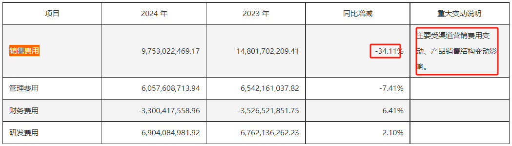 记者注意到,2024年格力电器的销售费用大幅降低50.5亿元,同比降幅达到34.11%,成为格力电器在营业收入下滑却力保净利润低两位数增长的最大“功臣”。在重大变动说明里,格力电器这样解释,“主要受渠道营销费用变动、产品销售结构变动影响”。
